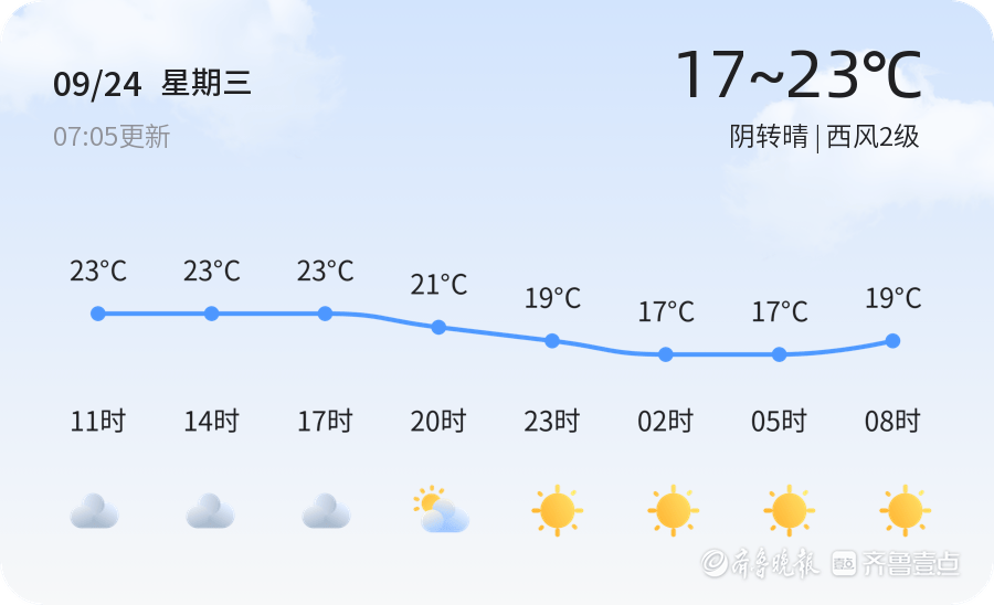 今天是9月24日,星期三,农历八月初三。烟台市今天天气为阴转晴,气温介于17℃至23℃之间,西风2级,空气湿度较高,达88%,PM2.5指数为23,空气质量良好。各区天气情况总体平稳,以阴转晴为主,风力不大,适合户外活动。