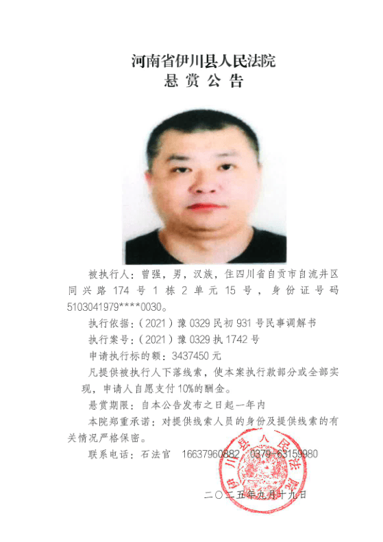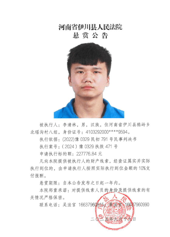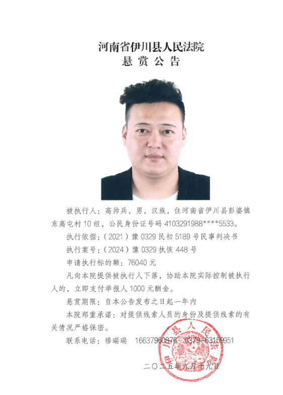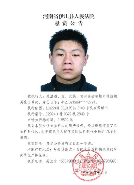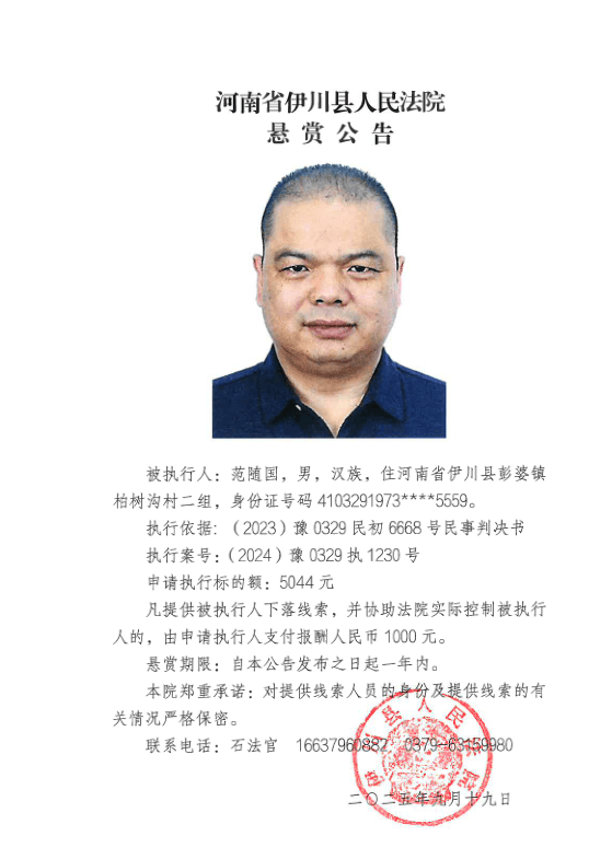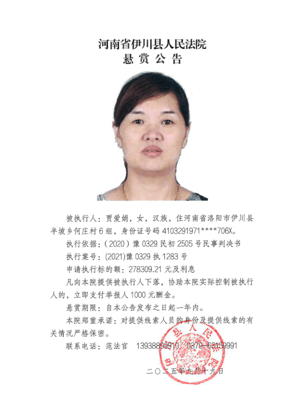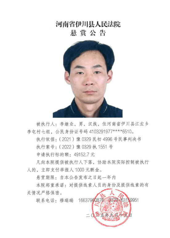 为进一步加大执行力度、发动社会力量查找财产线索、有效打击被执行人逃避债务行为,切实维护申请执行人的合法权益,伊川法院根据申请执行人的申请,依照《中华人民共和国民事诉讼法》第二百六十二条、《最高人民法院关于民事执行中财产调查若干问题的规定》第二十一条、第二十二条、第二十四条、《最高人民法院关于依法制裁规避执行行为的若干意见》第5条等相关规定,发布执行悬赏公告如下: