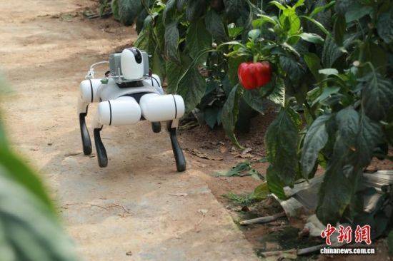 2025年3月28日,AI机器狗“旺财”在山东省潍坊市寿光现代农业高新技术试验示范基地大棚内巡检蔬菜病虫害情况。周艺伟 摄