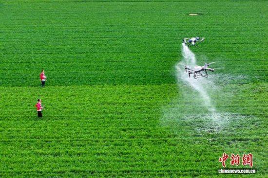 4月18日,在山东省聊城市茌平区乐平铺镇大尉庄村高标准农田里,茌平丰信农业服务有限公司技术人员操作植保无人机进行小麦“一喷三防”作业。(资料图)马红坤 摄