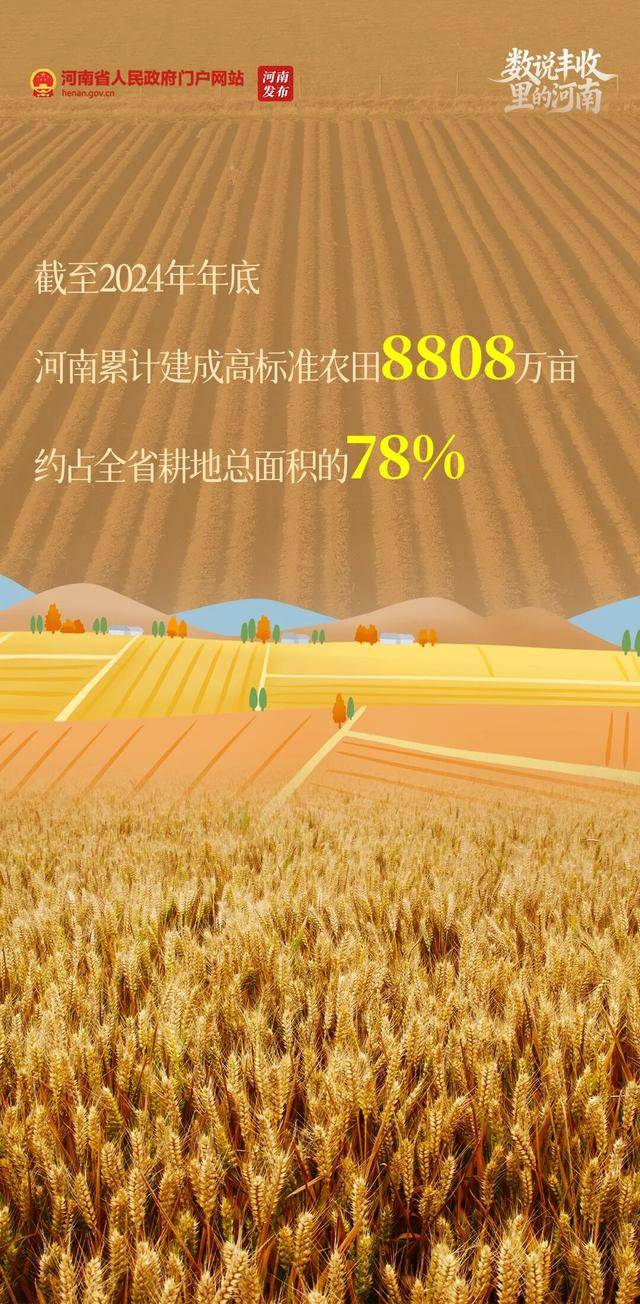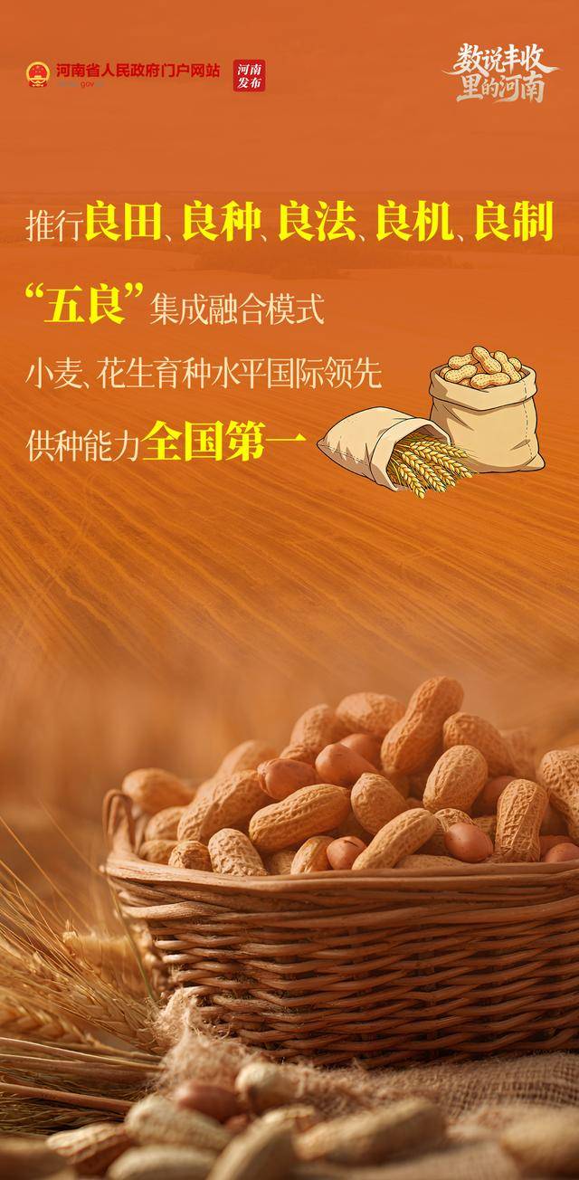 河南生产了全国1/10的粮食、超1/4的小麦,粮食总产更连续8年稳定在1300亿斤以上,为国家粮食安全筑牢根基;“五良” 集成融合模式发力,让河南小麦、花生育种水平跻身国际领先行列,供种能力稳居全国第一;农作物耕种收综合机械化率达89%,小麦、玉米等主要作物已实现全程机械化,科技为丰收注入强劲动能。