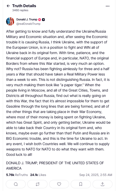 在周二发布上述帖子之前,特朗普早些时候在纽约联合国大会期间与泽连斯基举行了第二任期的第五次会晤。在闭门会谈之前,特朗普对记者说,他支持北约国家击落任何侵犯其领空的俄罗斯飞机。当被问及美国是否会支持北约盟国时,他说这将“取决于”具体情况。