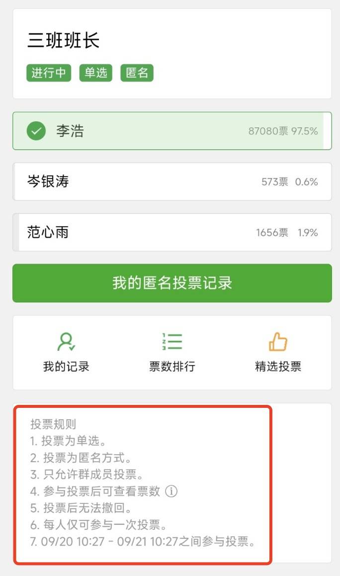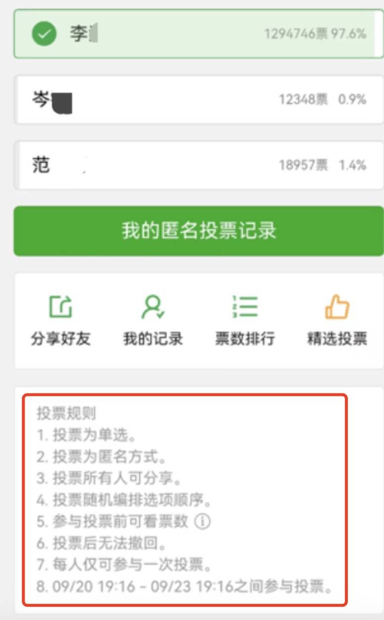 据记者在群聊中获取的信息,李某朋友转发的链接,投票参与时间为9月20日10:27分—9月21日10:27分,而此后广为流传的投票链接,可参与的投票时间却是9月20日19:16分—9月23日19:16分。