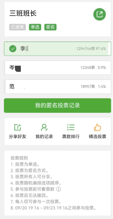 近日,一则某学校“三班班长”竞争的小程序投票在网络上走红。投票系统显示,最终有超132万人参与投票。最高的李同学获129万余票。