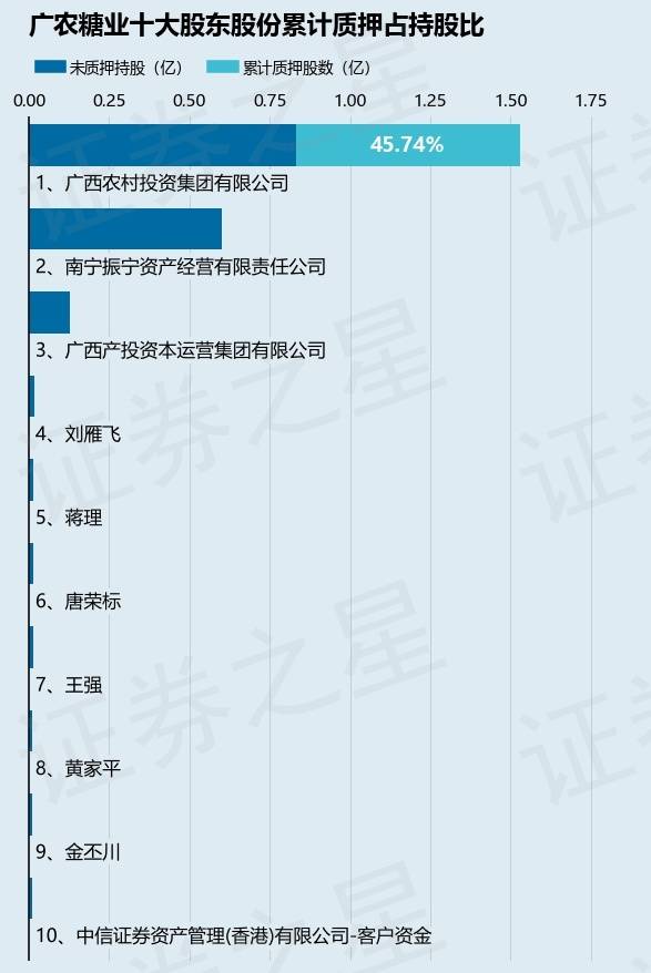 截止本公告日,股东广西农村投资集团有限公司已累计质押股份7000.59万股,占其持股总数的45.74%。本次质押后广农糖业十大股东的累计质押股份占持股比例(占持股比例的计算以公司最新一期财务报表公布的十大股东的持股总数为基准)见下图: