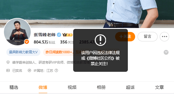 9月24日,观察者网查询发现,考研领域知名博主@张雪峰老师 的账号在微博、小红书、抖音和B站平台均被禁止关注。