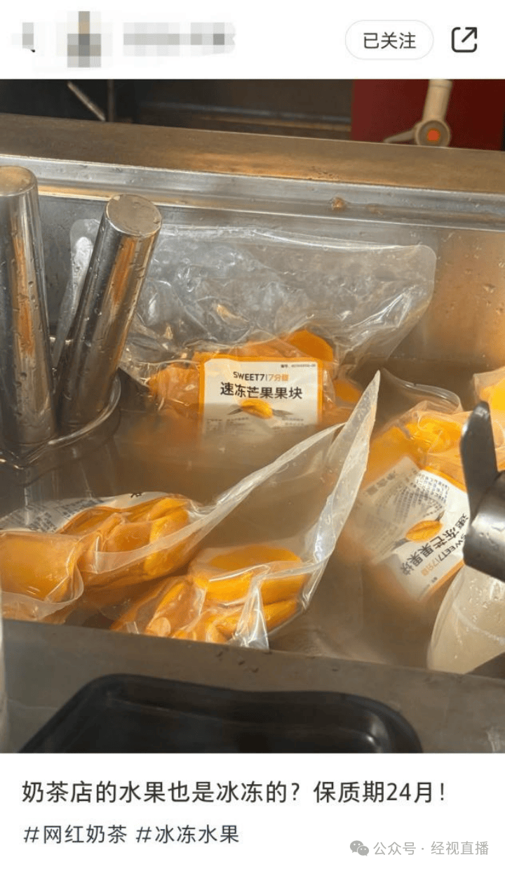 9月24日,经视直播记者联系上发帖网友。该网友表示,自己常购买7分甜的杨枝甘露,一直以为其使用新鲜芒果制作,没想到其使用的是速冻芒果且保质期达24个月。当记者追问具体是在哪家门店发现该情况时,网友未正面回应,仅强调使用速冻芒果果块的是7分甜品牌方。