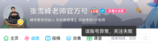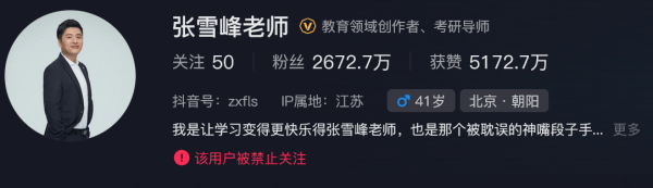 抖音同样显示,张雪峰账号被禁止关注。