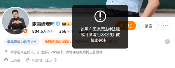 9月24日,知名教育博主张雪峰的多个平台账号被禁止关注。