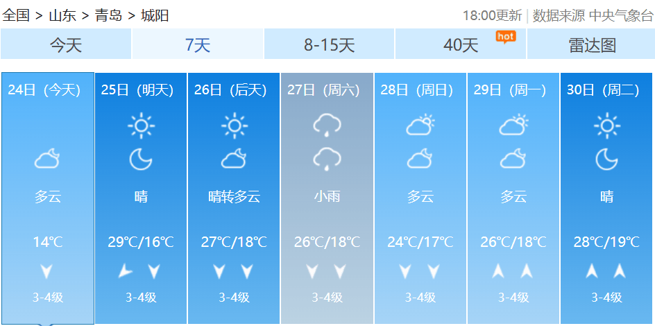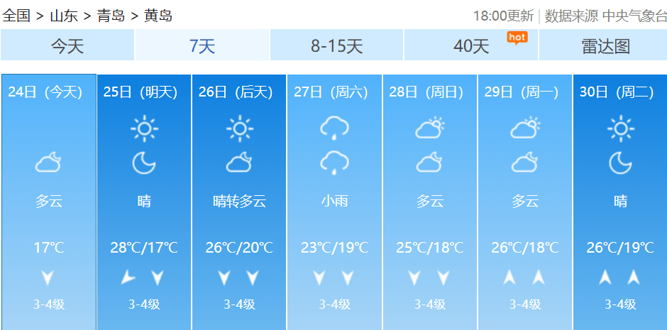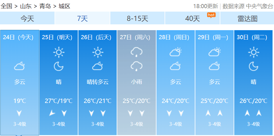 【青岛市区】25日白天,晴间多云,北到东北风3到4级,相对湿度50%~90%,25日最低气温19℃,最高气温27℃。
