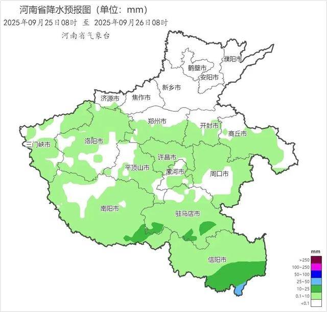 2025年9月24日20时至25日20时,河南省地质灾害气象风险预警达到黄色预警的区域为:洛阳大部,郑州西部,平顶山西北部,许昌北部,三门峡中部,南阳北部局部,发生地质灾害的风险较高。