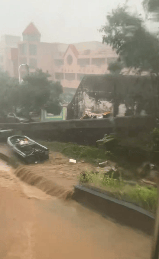 该船长提供的视频显示,街上已经空无一人,水已将街道淹没,临街商铺一层已有一半在水中。