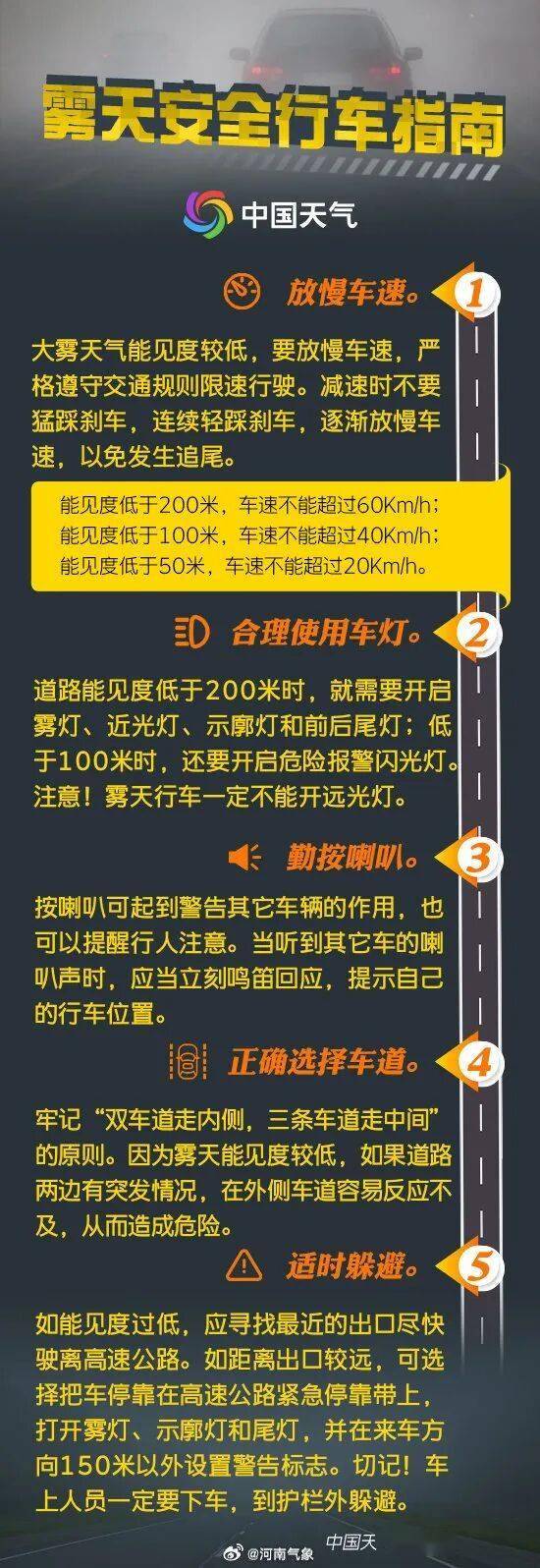 今晨,中东部、北部、西南部部分县(市、区)有浓雾,局地强浓雾。驾车出行要注意及时查看最新的预报预警信息和路况信息,大雾天气行车必须小心谨慎,这份行车安全提示请收藏转发!