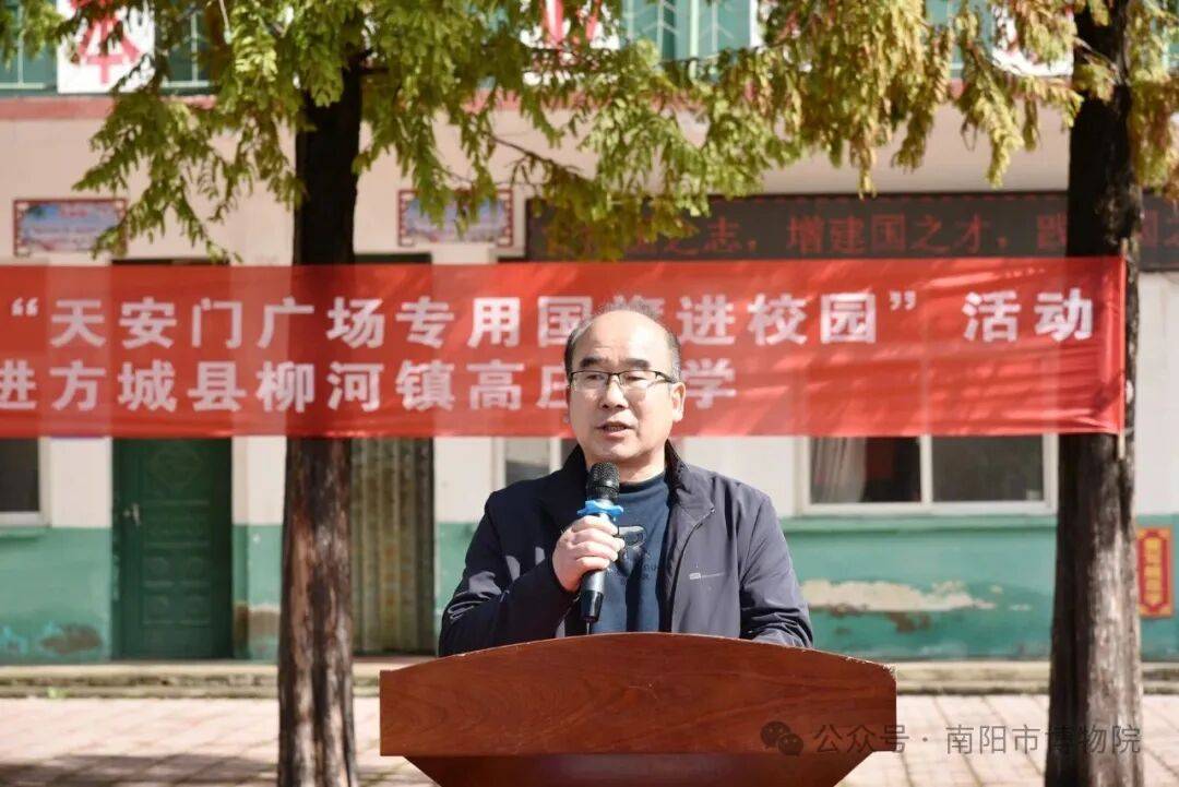 李红副院长在致辞中指出:“天安门广场专用国旗进校园活动不仅仅是一次简单的仪式,它是一堂生动形象的爱国主义及南阳移民精神的教育课。通过国旗进校园活动,要在校园中营造浓厚的爱国氛围,加深同学们对国旗的了解和认识,增强同学们的爱国情怀和民族自豪感。同时也希望通过这次活动,激发同学们的责任感和使命感,感悟红色精神的力量,坚定报国理想信念,传递红色精神,赓续红色基因,爱祖国、爱家乡,为实现中华民族的伟大复兴贡献自己的聪明才智。”