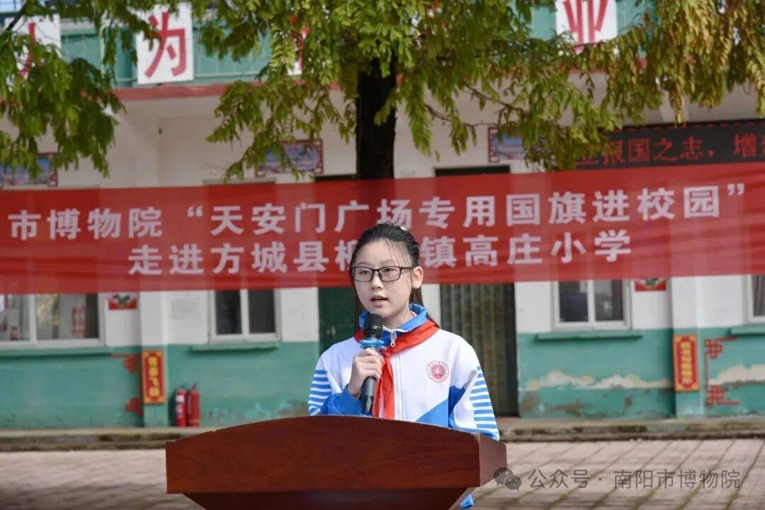 学生代表贾照慧在发言中说:“今天这面编号为我们播下了爱国的种子。让我们一起守护这颗种子,让它在心里生根、发芽,长成参天大树。未来的日子里,我们要以国旗为榜样,以南水北调精神为动力,努力学习、积极向上,长大后成为能为祖国添砖加瓦的好少年!”