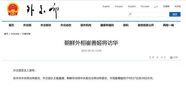 应中共中央政治局委员、外交部长王毅邀请,朝鲜劳动党中央委员会政治局委员、外相崔善姬将于9月27日至30日访华。