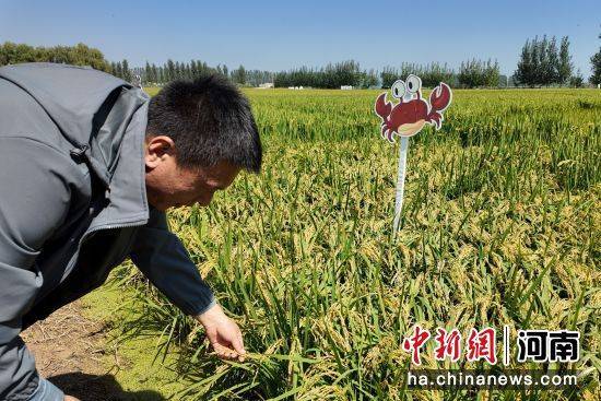 图为河南省农科院研究人员在查看稻谷长势。连晨宇 摄