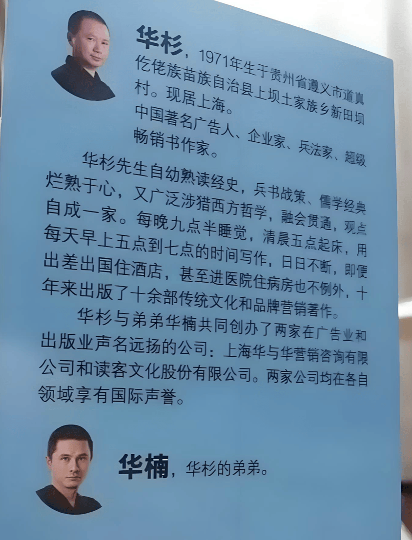哥哥华杉的简介足足有15行字,出生地从贵州省份具体到乡新田坝村子,身份从中国著名广告人、企业家到兵法家、超级畅销书作家,堪称广告界的“大冰”。