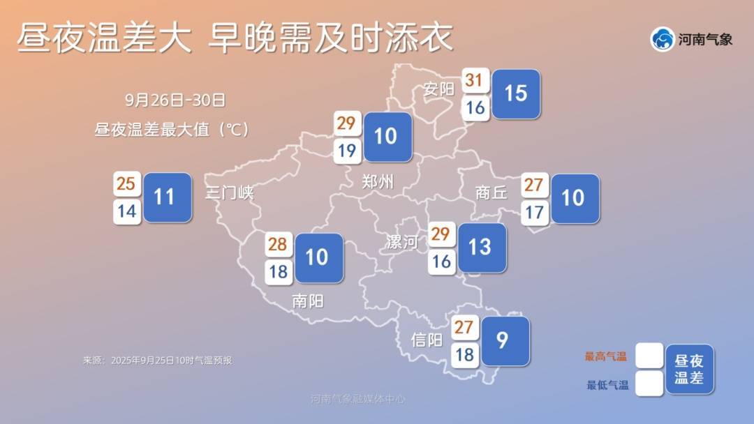 预计今后五天,我省最高气温相对平稳,基本稳定在25℃上下,最低气温15℃左右,昼夜温差逐渐增大,尤其是在30日,昼夜温差多地可超10℃。建议大家及时关注气温变化,适时调整着装,谨防感冒。