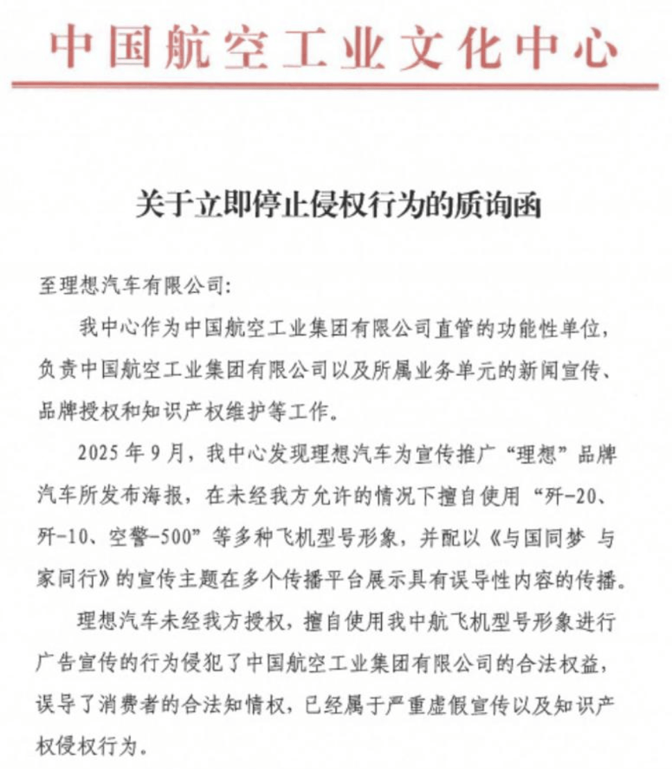 近日,有消息称中国航空工业文化中心向理想汽车发送了《关于立即停止侵权行为的质询函》。流传的质询函显示,中国航空工业文化中心表示,“理想汽车未经我方授权,擅自使用我中航飞机型号形象进行广告宣传的行为侵犯了中国航空工业集团有限公司的合法权益,误导了消费者的合法知情权,已经属于严重虚假宣传以及知识产权侵权行为。”