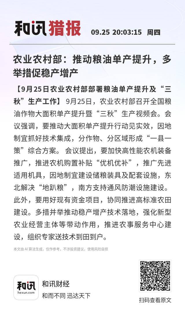 【9月25日农业农村部部署粮油单产提升及“三秋”生产工作】9月25日,农业农村部召开全国粮油作物大面积单产提升暨“三秋”生产视频会。会议强调,要推动大面积单产提升行动见实效,因地制宜抓好技术集成,分作物、分区域形成“一县一策”综合方案。 会议提出,要加快高性能农机装备推广,推进农机购置补贴“优机优补”,推广先进适用机具,因地制宜建设储粮装具及配套设施,东北解决“地趴粮”,南方支持通风防潮设施建设。 此外,要用好现有资金项目,协同推进高标准农田建设。多措并举推动稳产增产技术落地,强化新型农业经营主体等带动作用,推进农事服务中心建设,组织专家送技术到田到户。