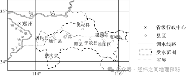 【3题详解】该工程是调水工程,主要作用是增加水资源供给,不能直接解决水污染问题,水污染需要靠污水处理等措施,①错误。调水后,豫东地区可用地表水增加,能减少对地下水的开采,从而缓解地下水超采问题,②正确。调水是为了保障和优化供水,不是减少居民用水量,相反能保障居民用水,③错误。该工程从南水北调中线总干渠取水,增加了豫东地区的水源,有助于构建多水源(本地水+外调水等)供水格局,④正确。综上所述,C正确,ABD错误。故选C。