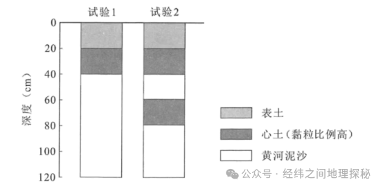【小问2详解】结合图示信息可知,与图1相比,图2充填的泥沙多一层心土层。心土层黏粒比例较高,具有较好的保水保肥功能,可以更大程度减少水分的下渗和养分的流失,利于保持土壤水分和肥力。另外,心土层较多有助于抑制深层土层中的水分向上蒸发,避免由此引发的土壤水分流失和表土返盐等现象。双层心土层的模式保水、保肥能力较强,有利于农作物的生长,提高粮食产量。