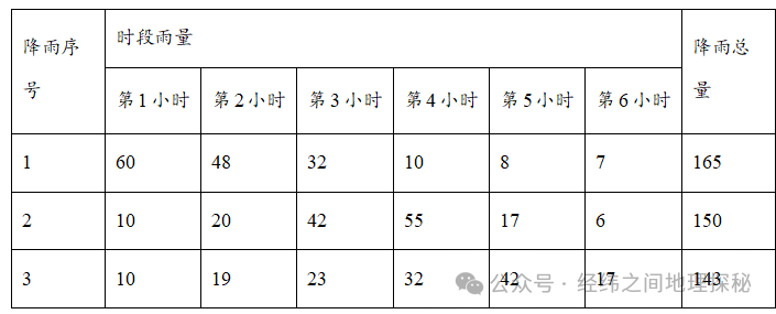 为探究降雨过程、土壤含水量与洪峰流量的关系,某科研小组在小流域模拟了形成相同洪峰流量的降雨过程,表为3次降雨过程数据(雨量单位:mm)。3次降雨前土壤含水量相同且偏低。据此完成下面小题。