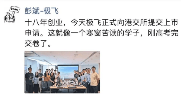 据悉,递交申请当天,极飞科技创始人、董事长彭斌发表朋友圈表示,十八年创业,今天极飞正式向港交所提交上市申请。这就像一个寒窗苦读的学子,刚高考完交卷了。