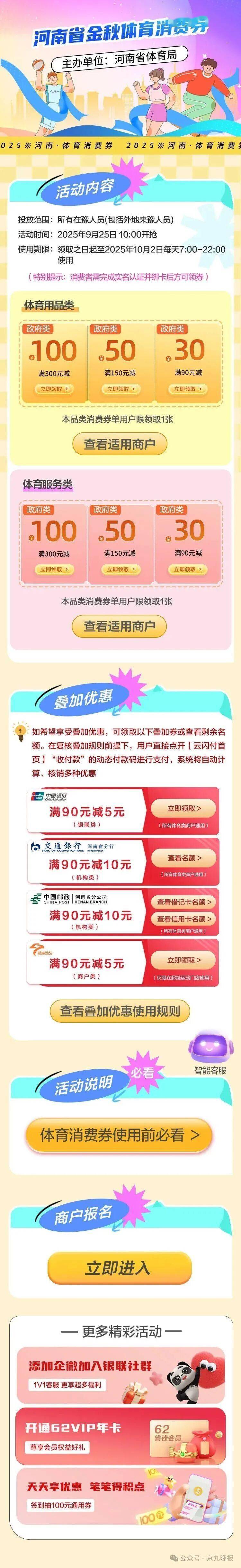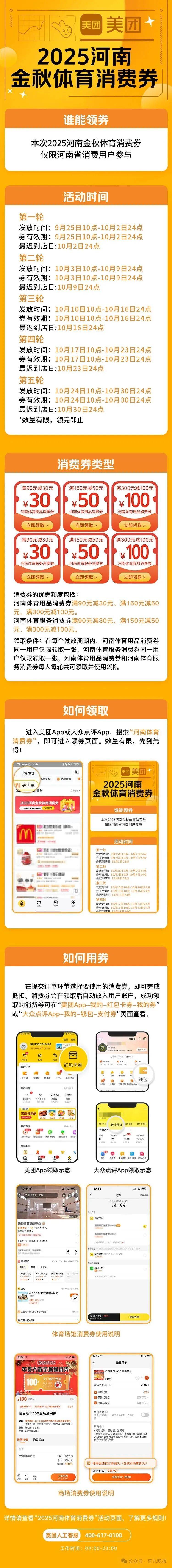 (一)河南省金秋体育消费券发放时间为9月25日—10月30日,共5个轮次。
