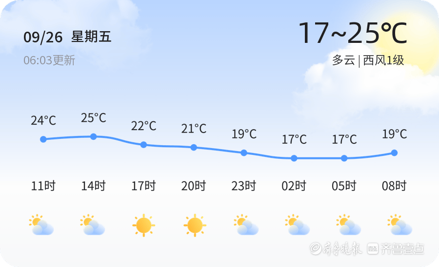 今天是9月26日,星期五,农历八月初五。烟台市今天天气以多云为主,气温较为舒适,最高气温25℃,最低气温17℃。风力较小,为西风1级,空气湿度较高,达98%。各区天气情况总体平稳,多云为主,无极端天气现象。当前时间为603,气温17.6℃。