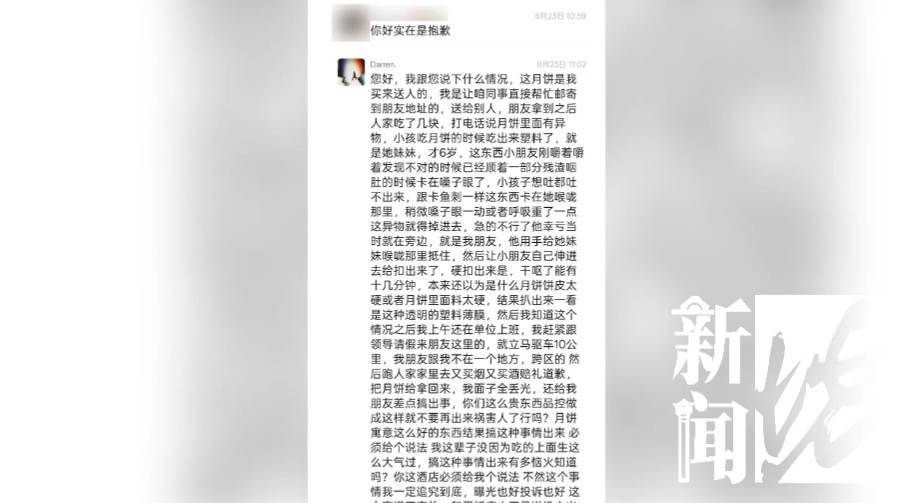 他跟我们说,小孩在月饼里吃到了塑料片,影响特别大,而且严厉地指责了我们,还想向外界曝光。
