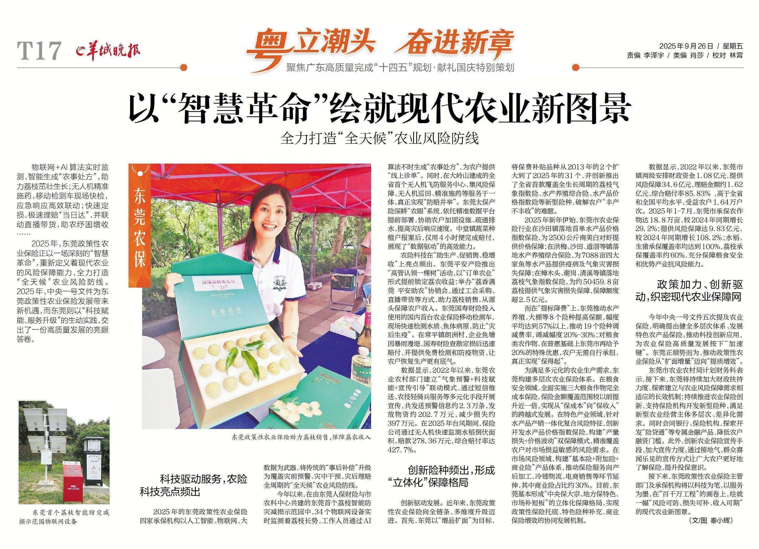 2025年,东莞政策性农业保险正以一场深刻的“智慧革命”,重新定义着现代农业的风险保障能力,全力打造“全天候”农业风险防线。2025年,中央一号文件为东莞政策性农业保险发展带来新机遇,而东莞则以“科技赋能、服务升级”的生动实践,交出了一份高质量发展的亮眼答卷。
