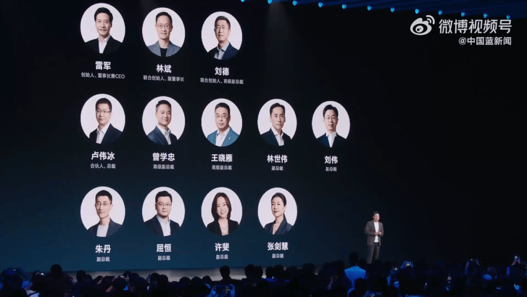 雷军在演讲中还提到了小米现在的12位高管:“大家可以看到我们今天高管团队的名单,早期还有两位和我在继续打拼,9位都是新面孔。我们引进外部的顶尖人才。这些同事为过去几年小米的发展做出了巨大的贡献。也借此机会感谢卢伟冰和这些人才。”