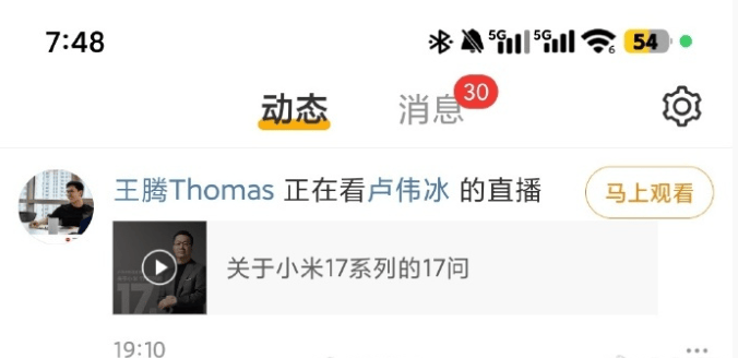 多位网友晒图称,王腾的微博动态显示,其正在看小米公司的直播。