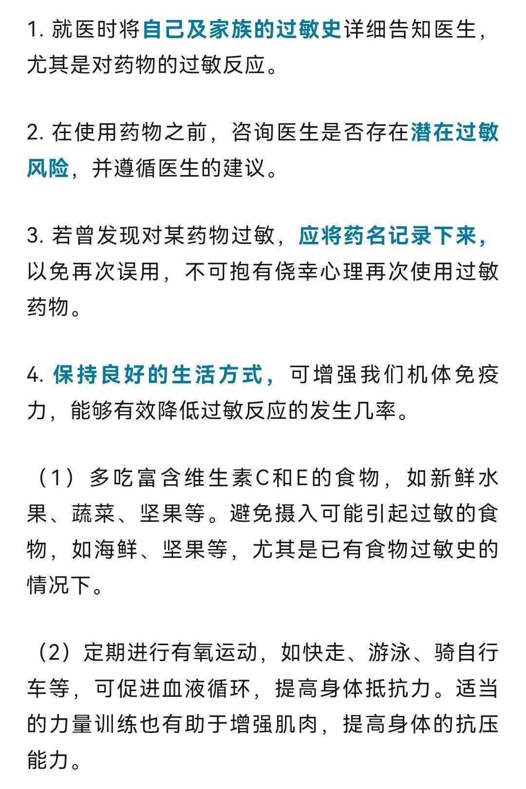 2. 一旦出现呼吸困难、喉头水肿、大面积皮疹等严重症状时,立即拨打120或去急诊。