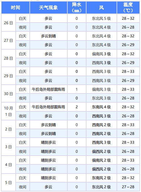 降水:未来十天以多云天气为主,其中30日、10月1日午后岛外有分散性雷阵雨。
