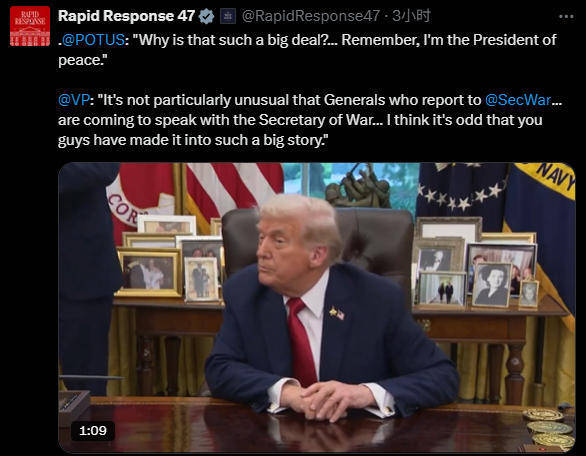 路透社9月25日援引消息称,美国“战争部长”赫格塞思已召集全球各地的美国高级军官下周在弗吉尼亚州匡提科(Quantico)会面。美国军事领导层齐聚一堂,实属罕见。有消息人士称,目前尚不清楚赫格塞思为何为此仓促地下达召集令,这已经在预期出席者中引发不确定性。