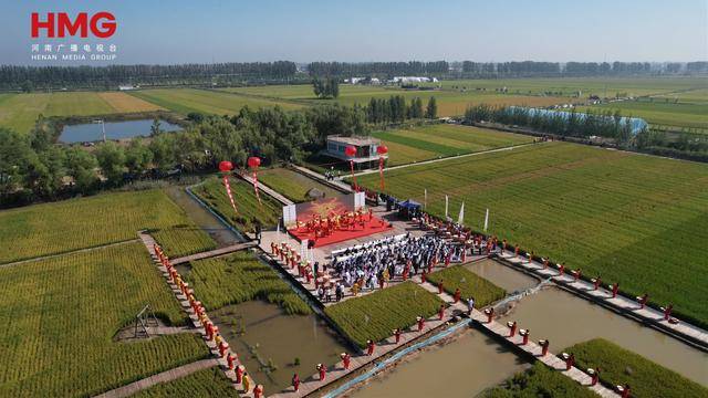 在原阳县太平镇水牛赵村的万亩稻田,《盘鼓》擂响了激昂序曲,唢呐《庆丰收》、歌伴舞《喜庆丰收年》等节目赢得阵阵掌声,太平镇12位村党支部书记身着农耕元素服饰走秀,为特色农产品代言,讲述着原阳稻田新故事。