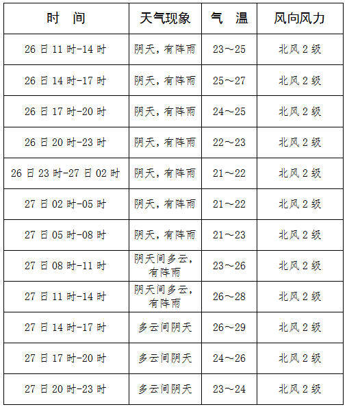 根据最新气象资料综合分析,9月26日-27日受东风扰动影响,冷水滩城区以阴天间多云天气为主,有短时阵雨,最高气温27~29℃,最低气温21~22℃,北风2~3级。