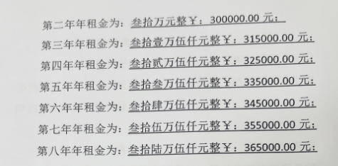 杨女士介绍,自己和丈夫在这条街开饭店已有16年时间,“在对面开了10年,2019年的时候,我拉着大宝抱着二宝跟这位房东见面了,在4月1日愚人节当天我们签了合同。”合同约定,第一年和第二年的房租为30万每年,从第三年开始,每年递增。