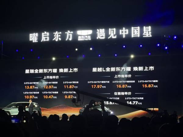 9月23日,吉利星瑞、星越L燃油双车推出全新东方曜系列,其中,定位A级轿车的星瑞,推出2.0T和1.5T两款动力共六款产品,定价9.87万—13.87万元;定位中高端SUV的星越L全系为2.0T车型,售价14.77万—17.97万元。