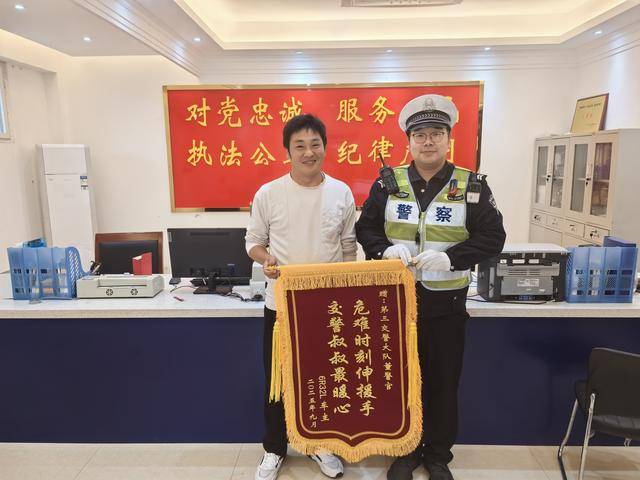9月26日上午,南阳市民李先生冒雨专程来到市交警支队第三勤务大队,将一面写有“危难时刻伸援手,交警叔叔最暖心”的锦旗送到大队辅警董俭剑手中,以最质朴的方式表达对梅溪交警在执勤工作中紧急救援,守护群众财产安全的真诚谢意。