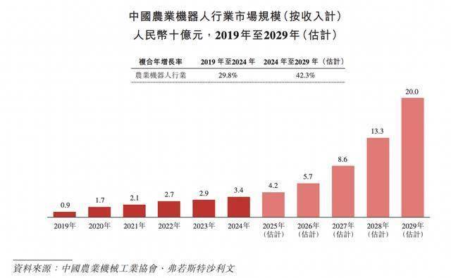 根据弗若斯特沙利文报告,按营收计,我国农业机器人市场规模由2019年的人民币9亿元增长至2024年的人民币34亿元,年均複合增长率29.8%。近年来,我国不断加速农业机械化进程,提升现代农业发展水平,农业机器人的引入和应用极大地改变了传统耕作方式,在解决劳动力短缺问题上发挥了重要作用,并显着提升生产效率,增加农业产出。预计至2029年,中国农业机器人市场将以42.3%的增速增长至人民币200亿元。未来,农业机器人将被引入育种、除草,以及果园、丘陵、山地作业等更多农业场景中,加速中国农业机器人行业的快速发展。
