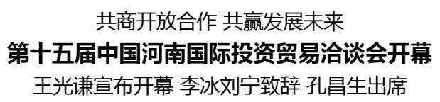 金秋九月,相“豫”中原。9月26日上午,第十五届中国河南国际投资贸易洽谈会在郑州国际会展中心隆重开幕。全国政协副主席、民盟中央常务副主席王光谦致辞并宣布开幕。全国工商联党组成员、副主席李冰,省委书记刘宁致辞。省政协主席孔昌生出席。