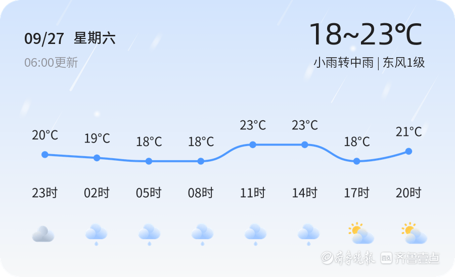 今天是9月27日,星期六,农历八月初六。济南迎来小雨转中雨天气,气温为15.8℃,东风1级,空气湿度高达94%。当前空气质量状况为良好,PM2.5指数为27。由于降雨天气,路面湿滑,建议市民出行时携带雨具,减速慢行,注意交通安全。