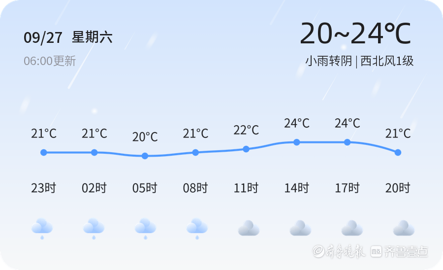 今天是2025年9月27日,星期六,农历八月初六。青岛市迎来小雨天气,气温在20℃至24℃之间,西北风1级,空气湿度较高,达到90%。PM2.5浓度为54,空气质量状况为良好。市民在出行时需注意携带雨具,行车时保持安全车距,确保交通安全。