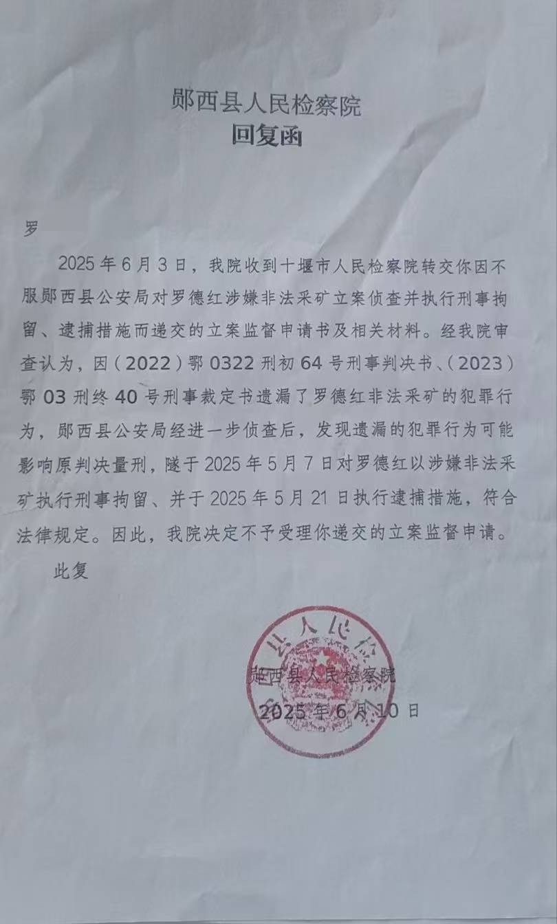 2025年3月,“罗德红非法采矿申诉案”获湖北省高院立案。同年5月,罗德红前往武汉途中再次被抓。2025年6月,郧西县检察院在一份《回复函》中称,郧西县检察院审查认为,罗德红的上述刑事判决遗漏了其非法采矿的犯罪行为,郧西县公安局经进一步侦查后,发现其遗漏的犯罪行为可能影响原判决量刑,遂于2025年5月7日对罗德红以涉嫌非法采矿罪执行刑事拘留。