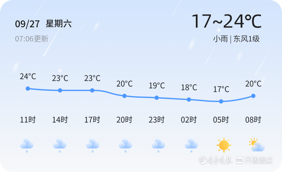 今天是2025年9月27日,农历八月初六,德州迎来小雨天气,气温在17℃至24℃之间,东风1级,空气湿度高达91%,PM2.5浓度为29,空气质量状况为良好。市民朋友们在外出时请注意携带雨具,雨天路滑,驾车时请减速慢行,确保行车安全。今天的空气质量良好,适合户外活动,但由于降雨,建议市民根据个人情况调整出行计划。