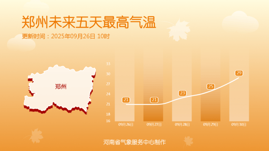 ——30日,全省转为晴好天气!最高气温也将迅速回升至30℃上下!以省会郑州为例,今起4天气温缓慢回升,最高温度在21-25℃之间,但雨过天晴之后,30日最高气温迅速升至29℃,中午前后短袖还不能丢~